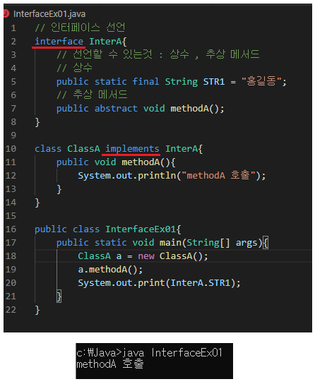 'ClassA'는 'InterA'를 구현한다.