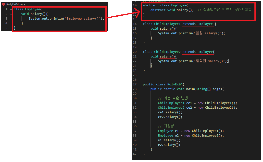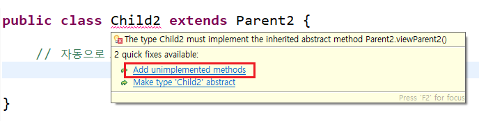abstract 메서드(); => {}를 써서 채울수 없다.