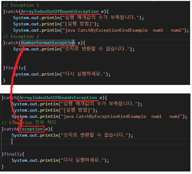 catch(ArrayIndexOutOfBoundsException e)와 같이 세부적인 에러처리 위에 오게되면 실행이 안된다.