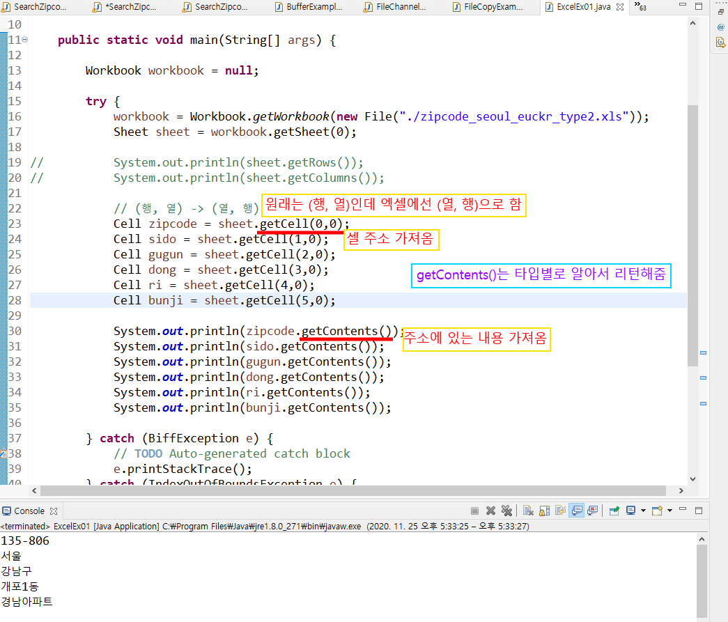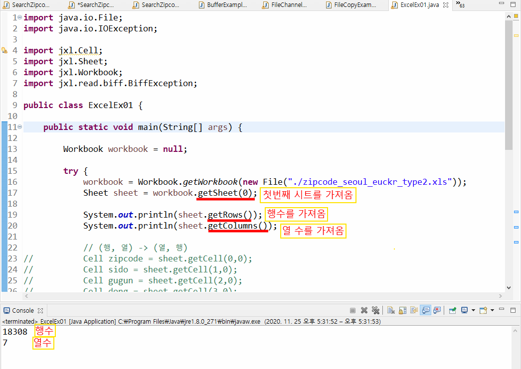 workbook = Workbook.getWorkbook(new File("./zipcode_seoul_euckr_type2.xls"));