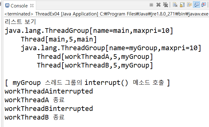 System.out.println("[ myGroup 스레드 그룹의 interrupt() 메소드 호출 ]" );