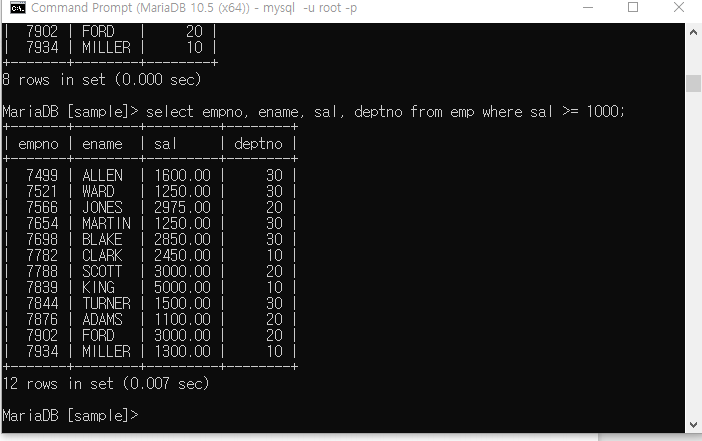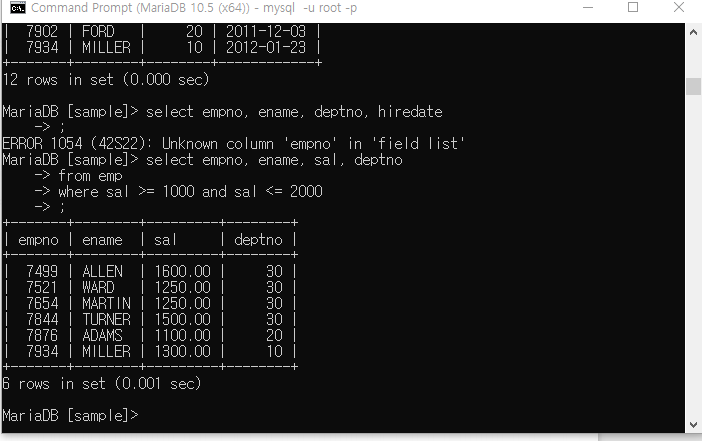 비교연산자 사용시 앞에 칼럼값이 와야해서 1000 <= sal <= 2000이 안되기 때문에 둘로 나눠야한다.