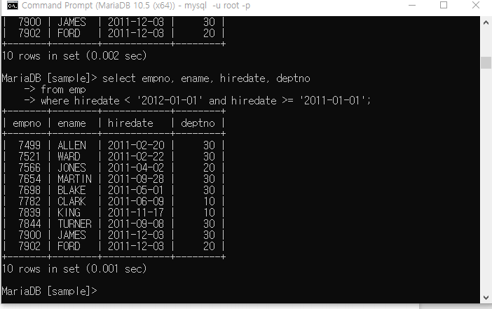 insert into emp values( 7900, 'JAMES', 'CLERK', 7698, STR_TO_DATE('3-12-2011','%d-%m-%Y'), 950, null, 30);