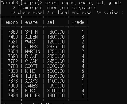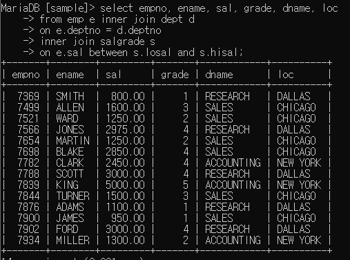 from emp e inner join dept d using(deptno) inner join salgrade s