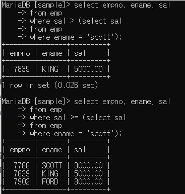 2) 복수행 서브쿼리(여러행, 1열) - 아래 4개 밖에 못씀