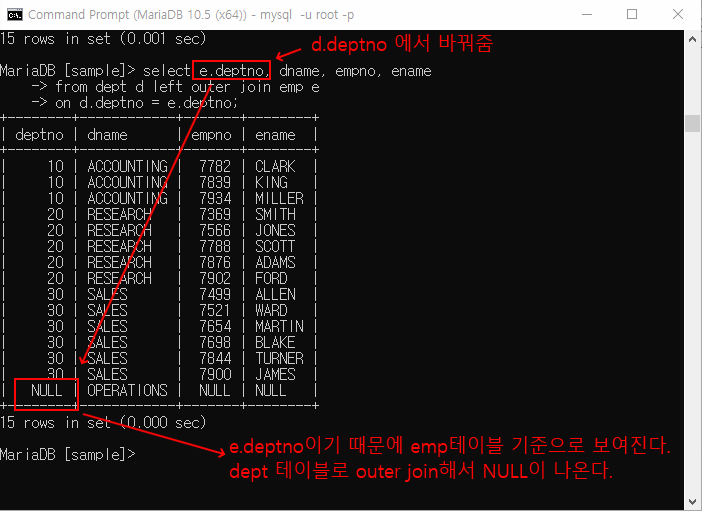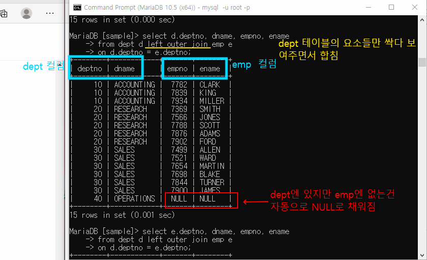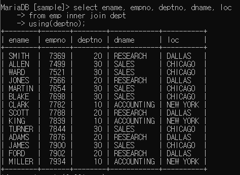예제) 테이블 emp와 dept이 가지고 있는 deptno 컬럼으로 둘을 합치기