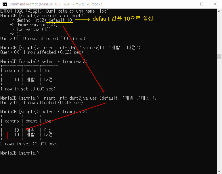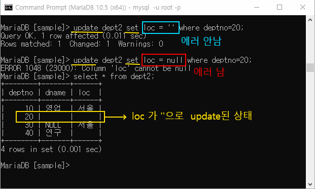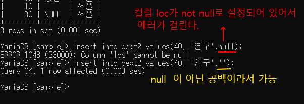 not null 로 설정된 컬럼에 null을 insert하면 에러가 발생한다.