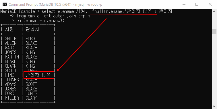 8. 7번 결과에서 상위 관리자가 없는 모든 사원의 이름도 사원명에 출력되도록 수정하시오.