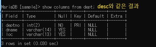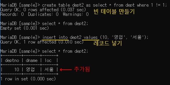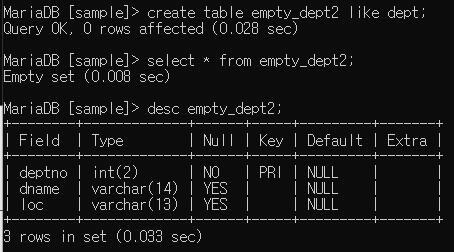 create table dept3 as select loc, deptno from dept where deptno = 10;