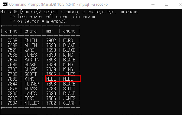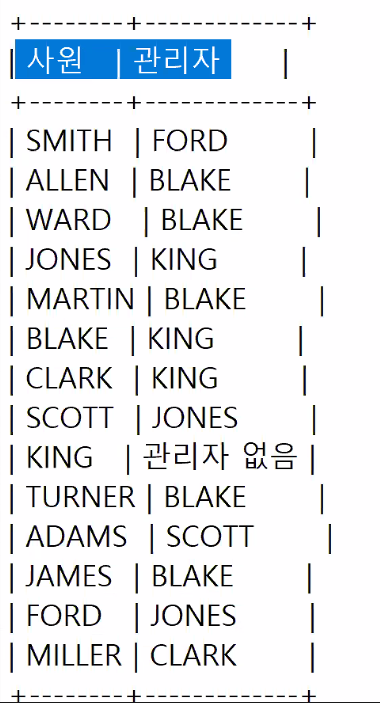6. 사원 테이블에서 사원명과 해당 사원의 관리자명을 검색하시오.