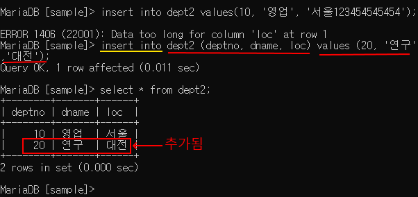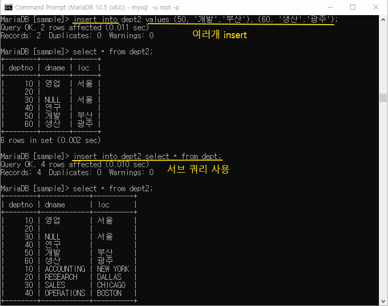 insert into 테이블명 (컬럼명, 컬럼명, 컬럼명) values (값, 값, 값);