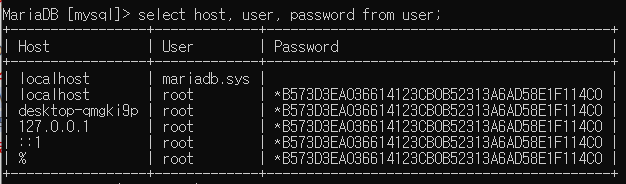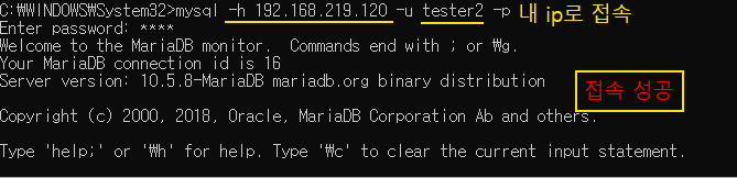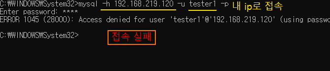 로컬 호스트로 권한을 줬기 때문에 내 ip주소로는 접근 불가