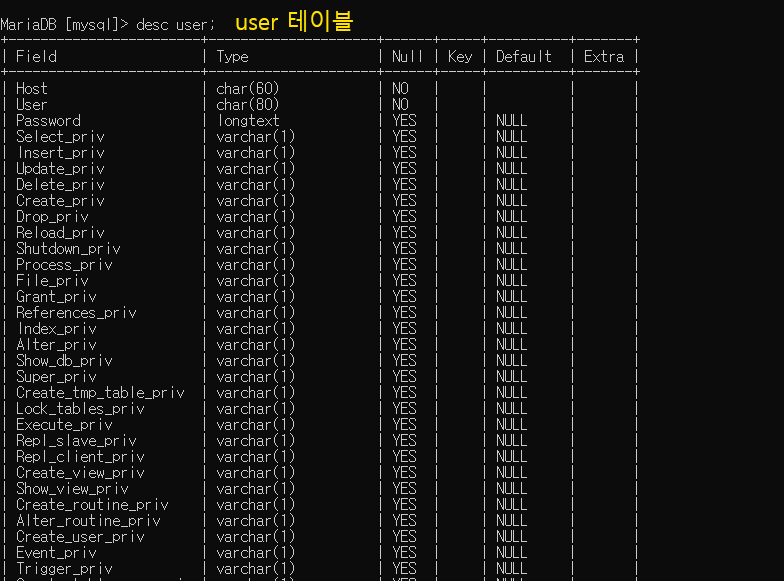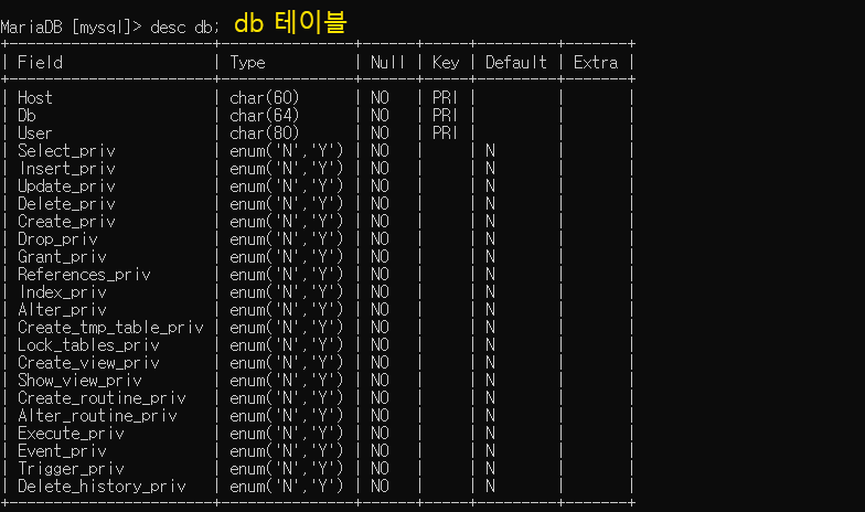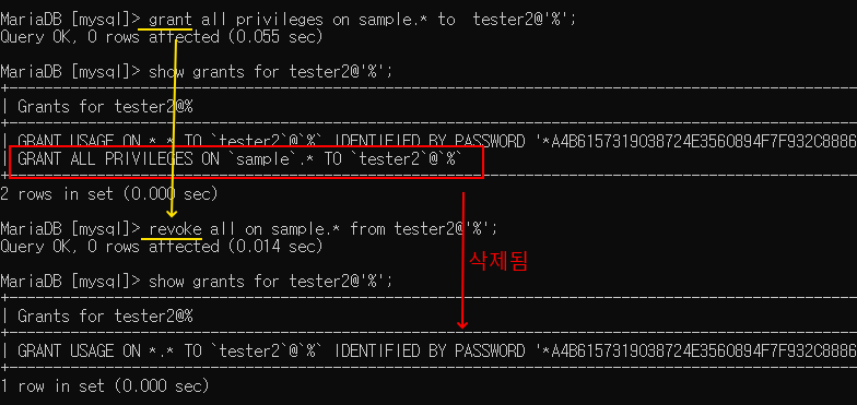 grant로 권한을 주고 revoke로 권한을 삭제하면 user 의 권한에서 권한이 삭제된걸 확인 가능하다.