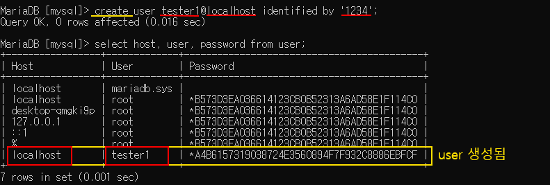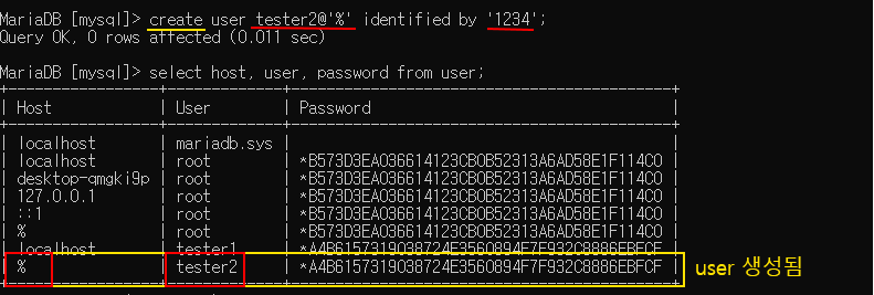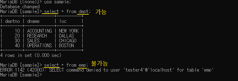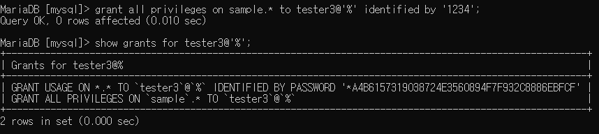 grant select, insert on sample.dept to tester4@'%' identified by '1234' ;