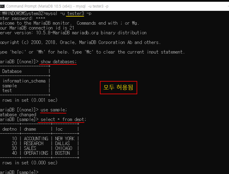 갖고 있는 권한을 확인 후, sample이라는 데이터베이스에 대한 모든 권한을 부여