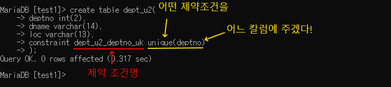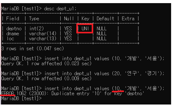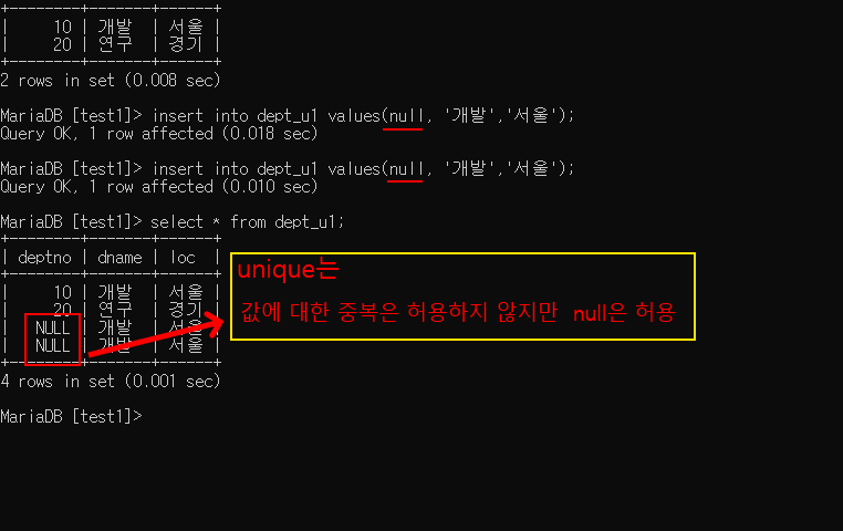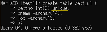(unique는 컬럼단위 제약조건이고 distinct는 select할때의 조건이라는 점에서 차이가 있음)