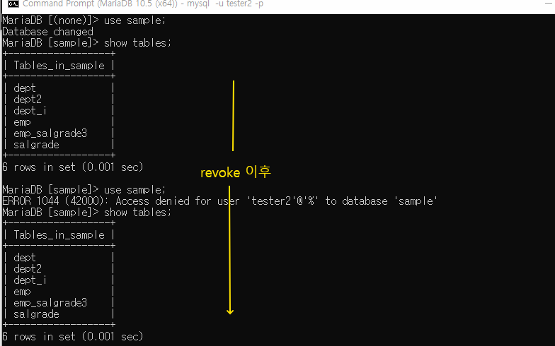 sample 데이터에 대한 모든 권한을 삭제 후 갖고 있는 권한을 확인