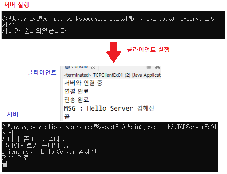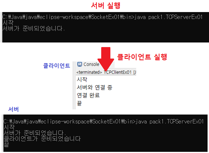 - 서버 실행 → 서버 대기상태 → 클라이언트 실행 → 서버마저 실행 → 끝