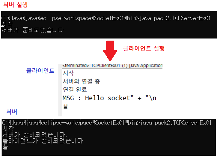 - 서버 실행 → 서버 대기상태 → 클라이언트 실행 → 서버마저 실행 → 끝