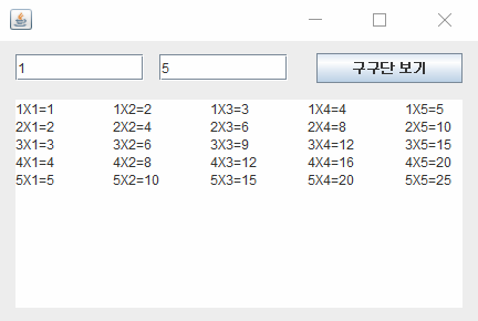 구구단 시작단, 끝단 입력 받아서 버튼 누르면 textArea에 구구단 출력하기