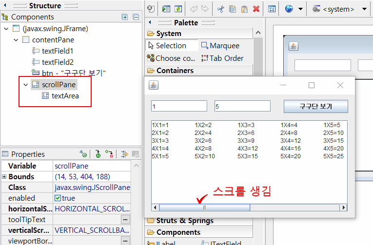 이렇게 textArea에 구구단이 잘려서 나올수 있으므로 textArea를 Jscrollpane안에 넣어줘야한다.