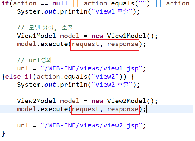 if ~ else if 문으로 request.getParameter("action") 값에 따라 각각의 jsp페이지로 url을 정의한다.
