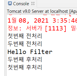 여러개 필터 사용 ( 이름만 다르고 doFilter() 메서드의 코드가 같은 여러개의 filter를 만들면 이름순서대로 실행이됨)