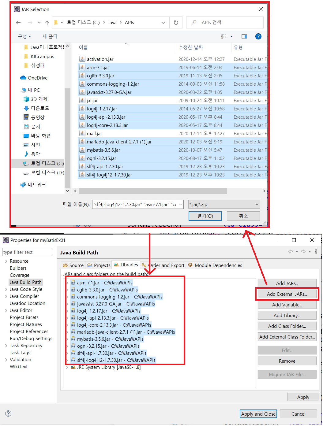C:\Java\APIs 여기에 모든 jar파일을 넣는다. (APIs - 프로젝트에서 라이브러리 추가 쉽게하려고 api 모아둔 폴더)