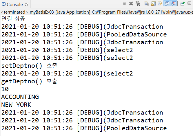 실행 파일인 myBatisEx01.java를 만들어서 실행시키면 파일이 제대로 가져와 지는지 확인이 가능하다.