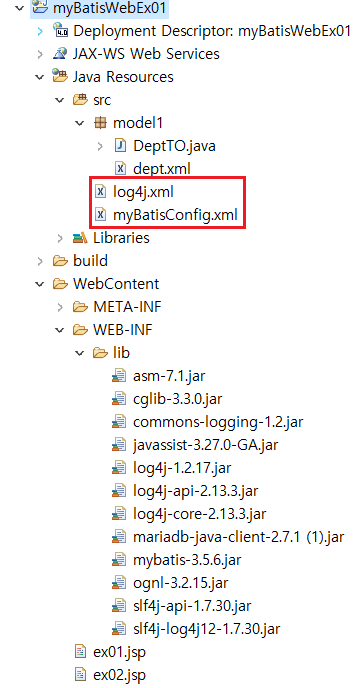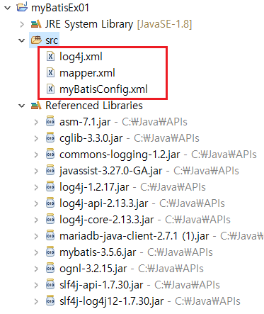 그리고 log4j.xml과 myBatisConfig.xml 파일을 와서 'Java Resources > src' 에 넣는다.