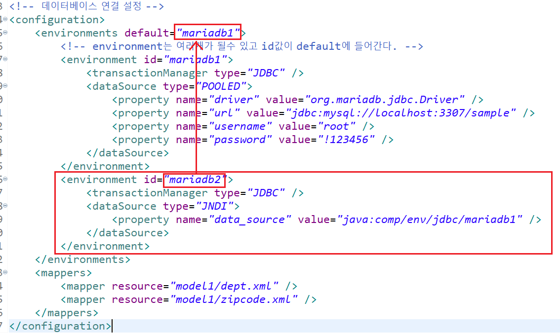 그리고 다음과 같이 environments의 default를 커넥션 풀의 id로 해주면 된다.
