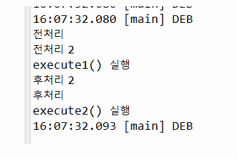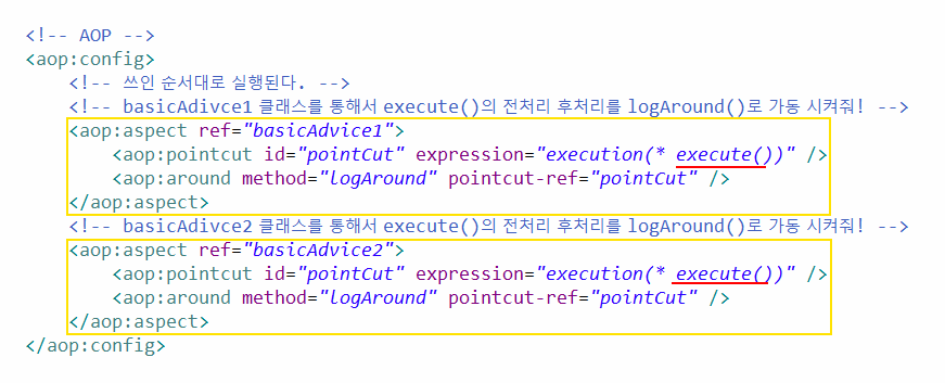 <!-- basicAdivce2 클래스를 통해서 execute()의 전처리 후처리를 logAround()로 가동 시켜줘! -->