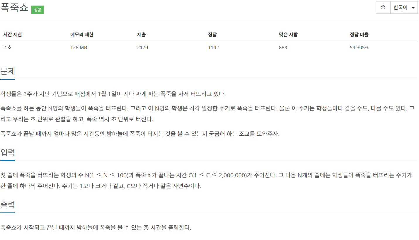 [C++] 백준 1773번 : 폭죽쇼 본문