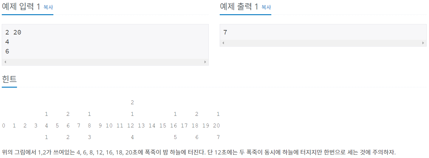 입력받은 주기들중 하나의 주기라도 1~N 의 수 중 하나와 나누어 떨어지면 한번으로 세어지는 것이 포인트이다.