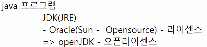 java 프로그램 언어를 실행시키려면 jdk가 있어야 하고 jdk안엔 jre가 있고 이건 oracle에서 만든다. 원랜 sun에서 만들고 오픈소스로 공개를 했고 이걸 통해서 openJDK라는 오픈소스 JDK를 만들었다. 오라클에서 만든건 라이센스가 있고 openJDK는 오픈라이센스다.