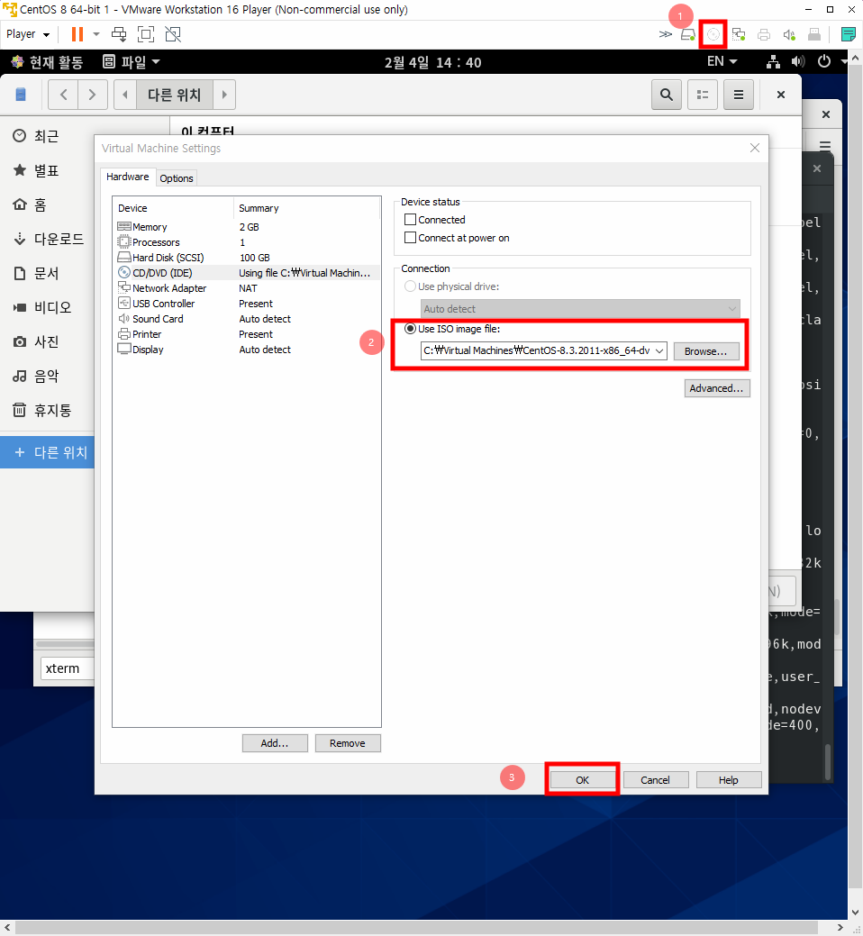 usb 를 연결하면 호스트와 가상환경 중 어디에 연결할거냐는 창이 뜬다. 거기서 가상 환경을 누르면 된다.