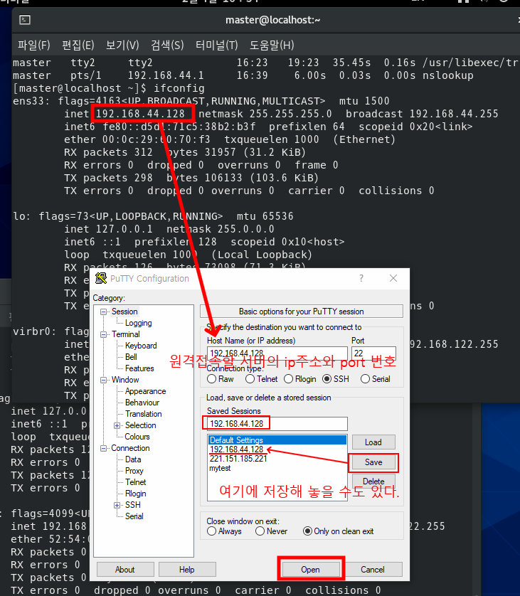 거기에 다음과 같이 원격 젒고 하고자 하는 서버의 ip주소와 port번호를 입력하면된다.