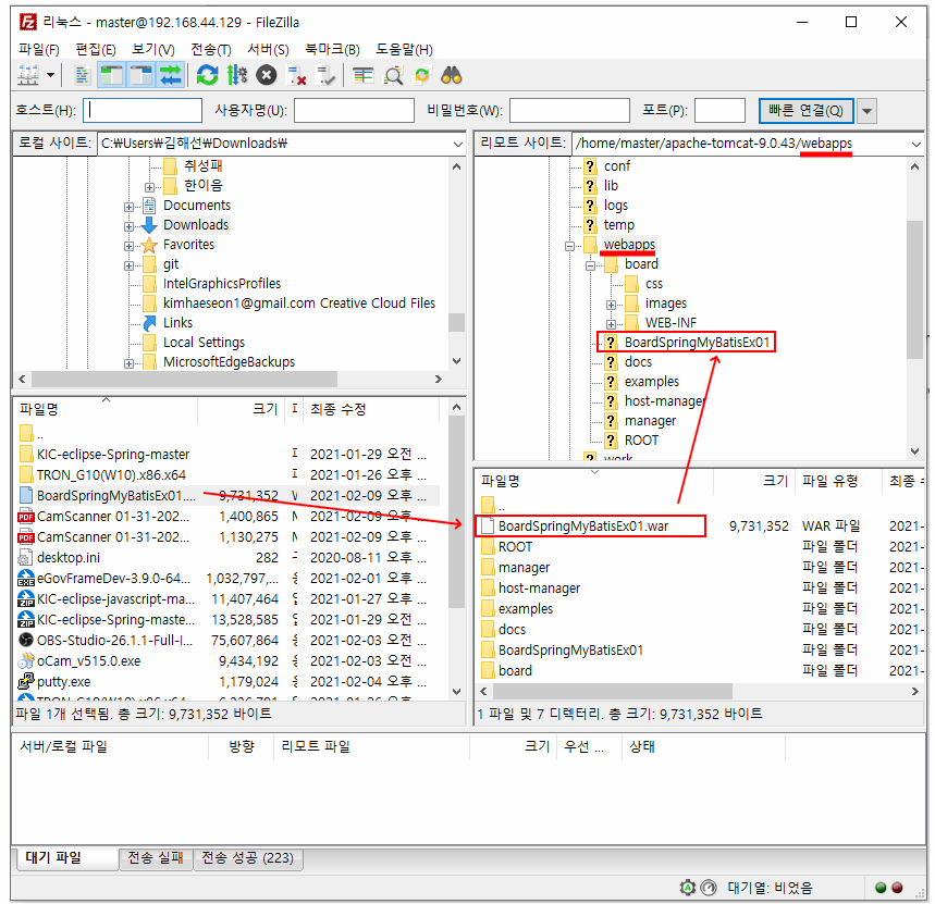 ftp로 각각 옮기거나 war로 옮긴 후 리눅스 서버에서 실행명령어를 실행한다.
