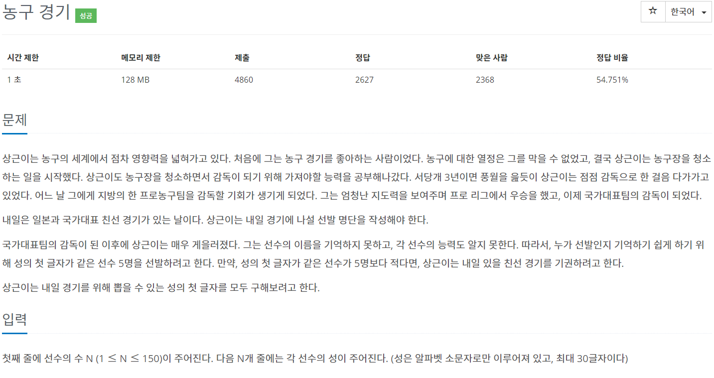 //해당 알파벳으로 시작하는 선수들이 5명 이상인 경우