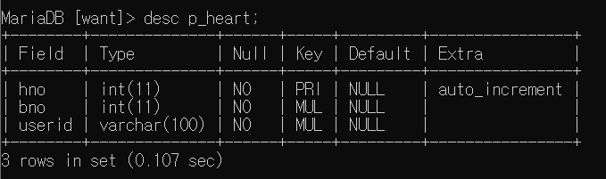 | 0 | hno | 좋아요 번호 | int(11) | primary_key auto_increment |