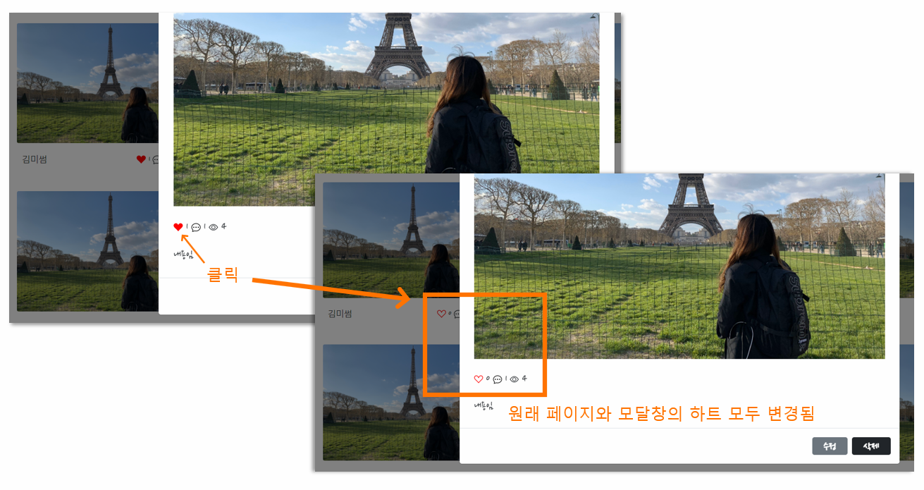 카드를 클릭하면 나오는 모달창에서도 하트클릭이 가능하다.