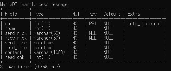 | 7 | read_chk | 받는사람이 메세지 읽었는지 체크 안읽었으면1, 읽었으면 0 |