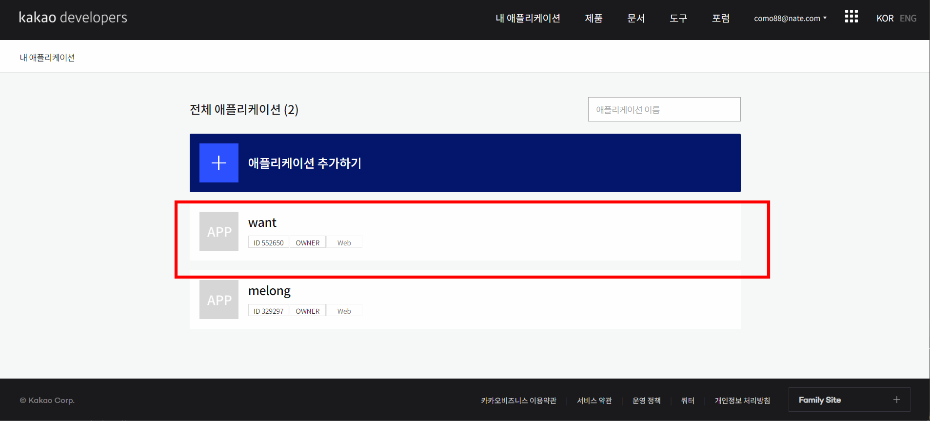 가장 먼저 kakao developer에 로그인해서 애플리케이션을 하나만든다.