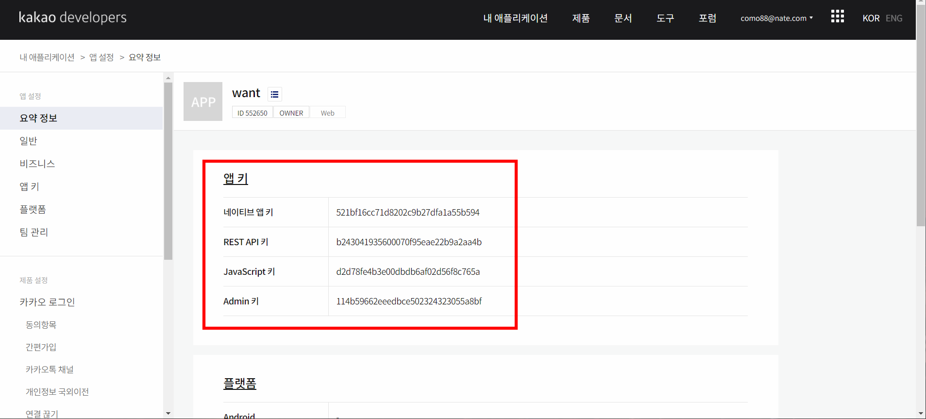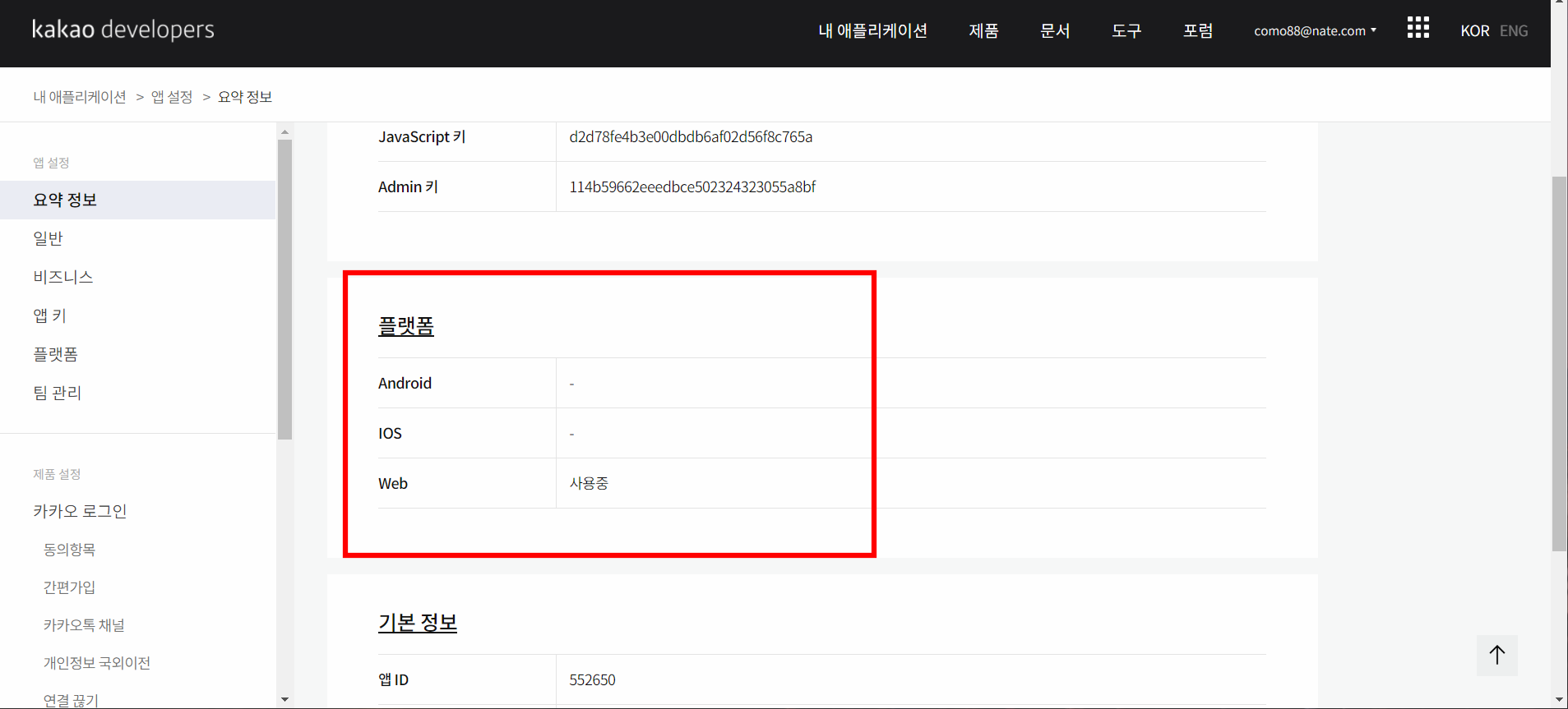 그러면 해당 애플리케이션은 아래처럼 앱키를 받는다.