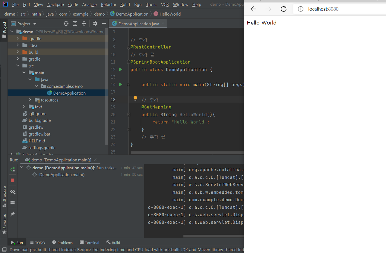 hello world를 띄우기 위해 다음과 같이 코드를 추가하고 8080포트로 실행시키면 된다.