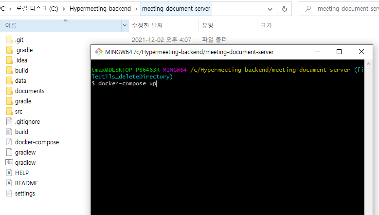 1) 프로젝트 안에서 git bash를 실행시킨 후, docker-compose up 명령어를 실행시킨다.