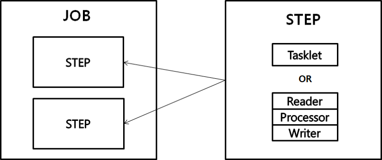 Spring Batch에서의 Job은 여러가지 Step의 모음으로 구성되어 있으며 Job은 순차적인 Step을 수행하며 Batch를 수행하게 됩니다. Step은 Tasklet 처리 방식과 Chunk 지향 처리 방식을 지원하고 있습니다.