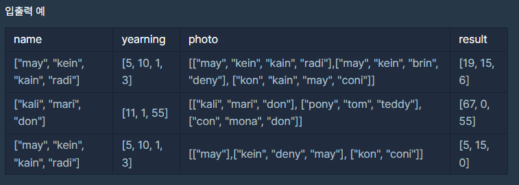public int[] solution(String[] name, int[] yearning, String[][] photo) {