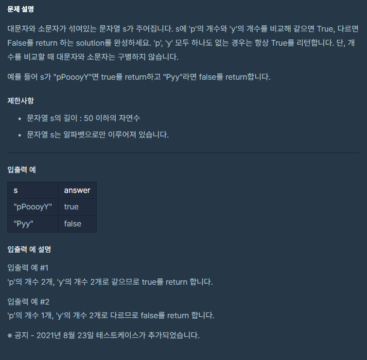 프로그래머스 level1 : 문자열 내 p와 y의 개수 - Java 본문