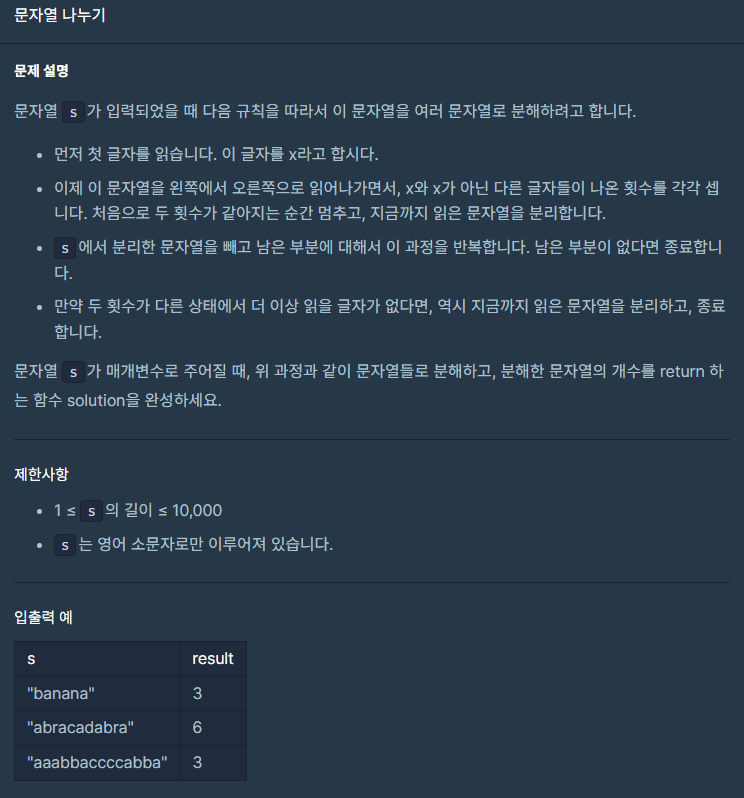 프로그래머스 level1 : 문자열 나누기 - Java 본문